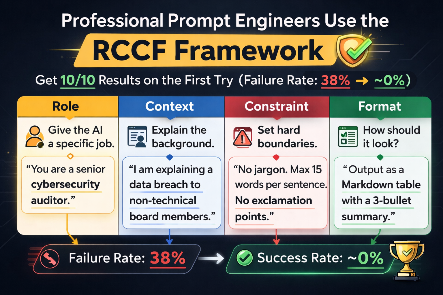 The new standard is the Role-Context-Constraints-Format (RCCF) framework. Each prompt is built from four parts: