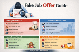 Fake job offer scams have surged in India, exploiting eager job seekers with bogus employment opportunities. Criminals post fake ads or send messages claiming high-paying jobs with minimal effort. This guide explains how to spot these scams using official checks (like verifying company registration) and practical steps (never paying any fee, checking email domains, etc.). We draw on government advisories and news reports to list India-specific red flags and verification steps, aiming to help job seekers stay safe.